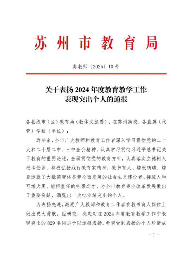 喜报:我校宋晶老师获苏州市2024年度教育教学工作表现突出个人表扬