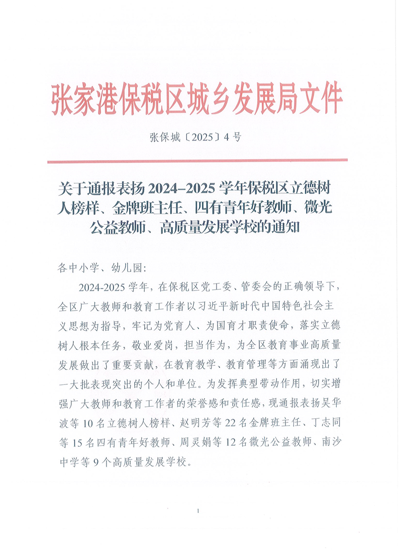 喜报:我校吴华波副校长被评为2024-2025学年保税区立德树人榜样、赵明芳老师被评为金牌班主任、丁志同老师被评为四有青年好教师、我校被评为保税区高质量发展学校 来源: 发布时间:2025-09-11 14:14:45 浏览次数: 次 【字体:小 大】 分享到: 【打印正文】