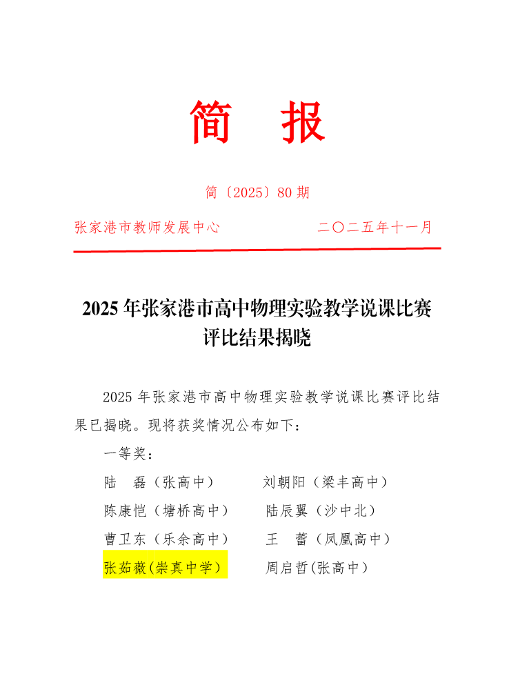 喜报:我校张茹薇、王文刚老师在2025年张家港市高中物理实验教学说课比赛中荣获佳绩